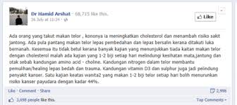 Sebab ramai mendakwa makan telur dalam jumlah yang banyak boleh menjejaskan kesihatan kerana tahap kolesterol yang tinggi. Namun adalah benar fakta ni??